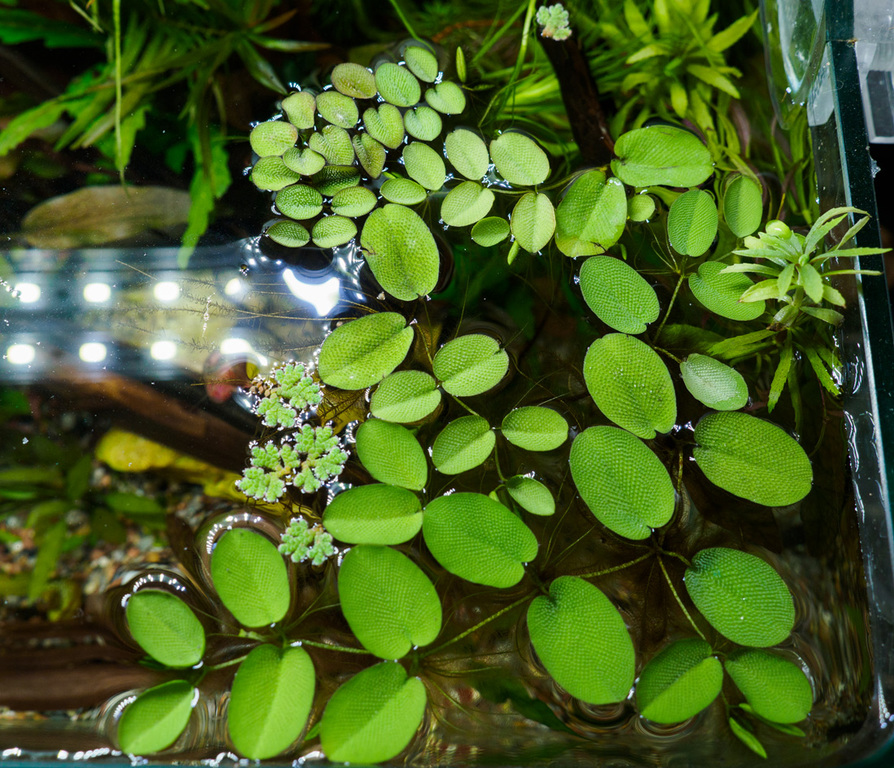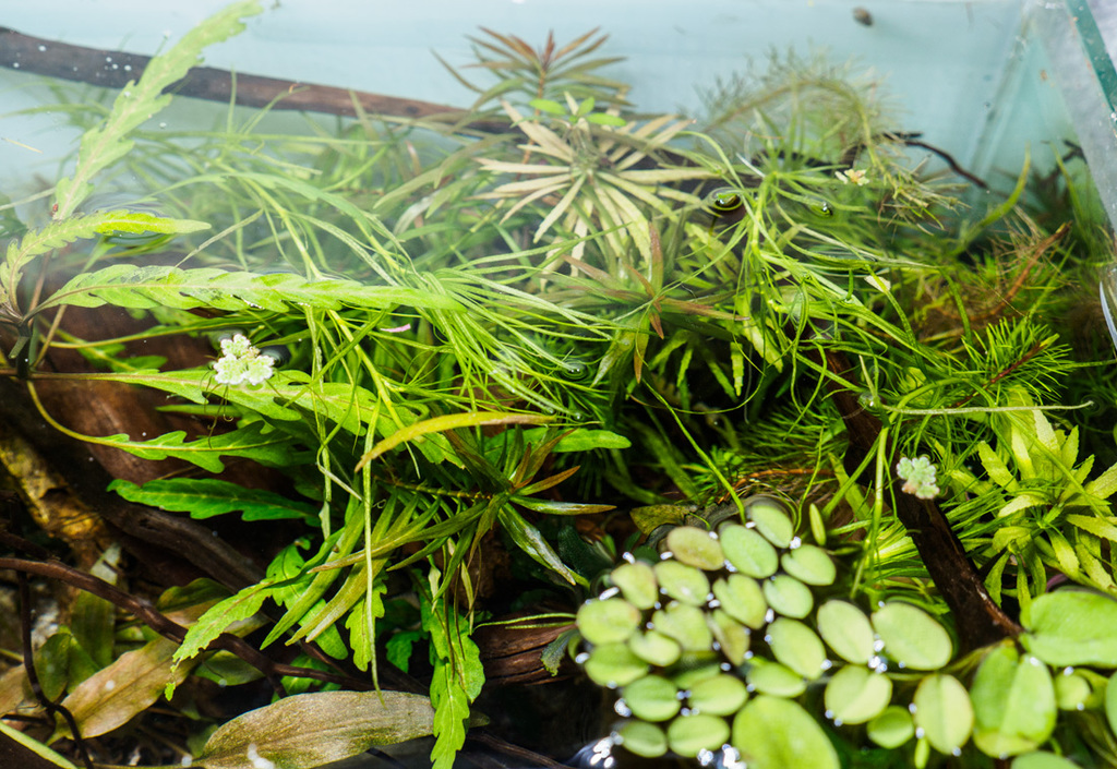 Bepflanzt wurde mit Echinodorus, Cryptocorynen, Bucephalandren, Hygrophila pinnatifida und einigen Stengelpflanzen im Hintergrund.